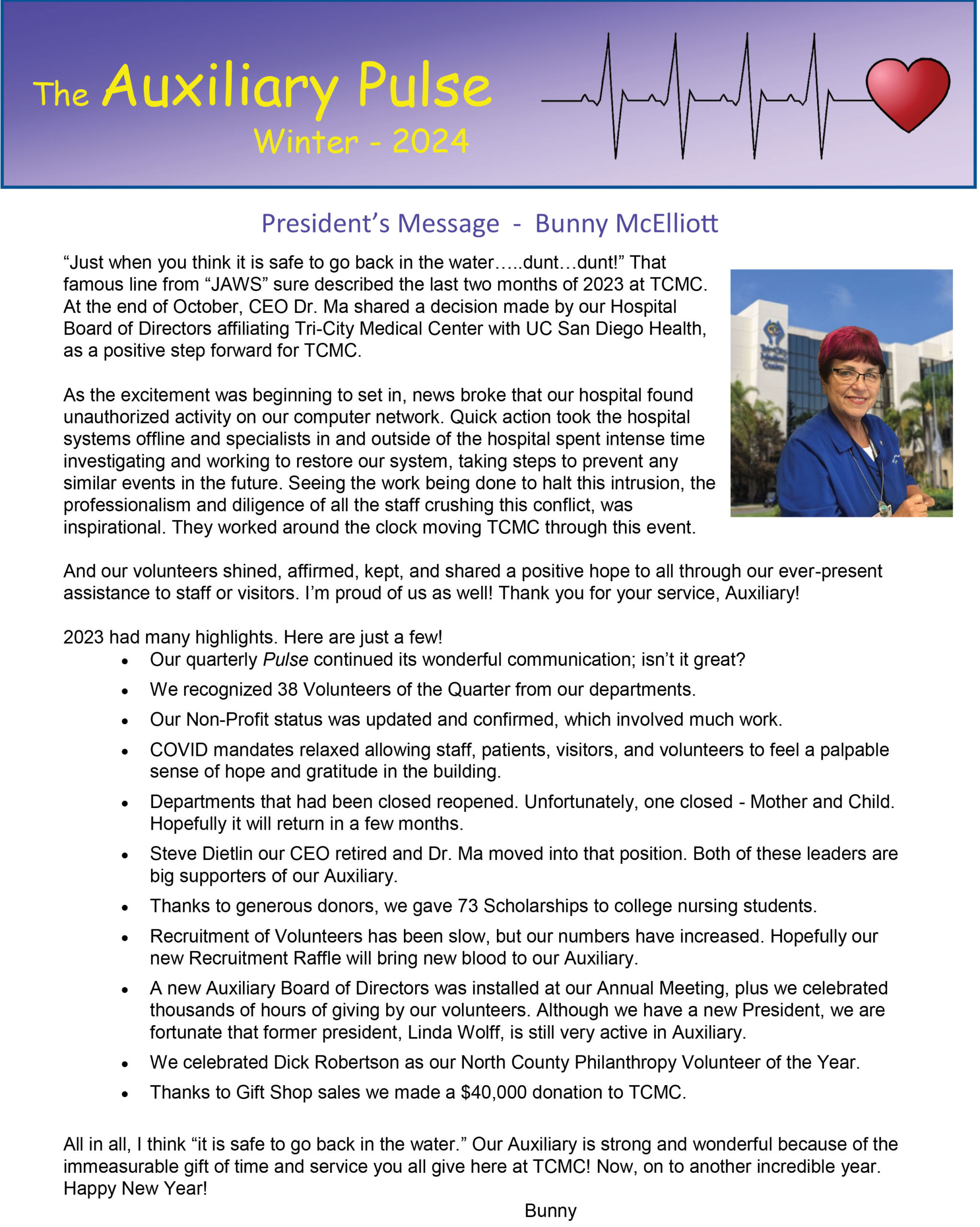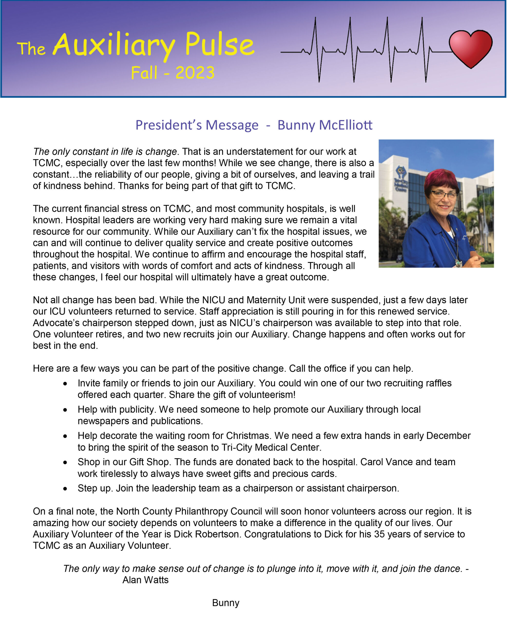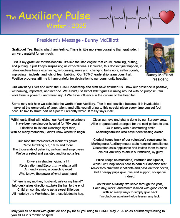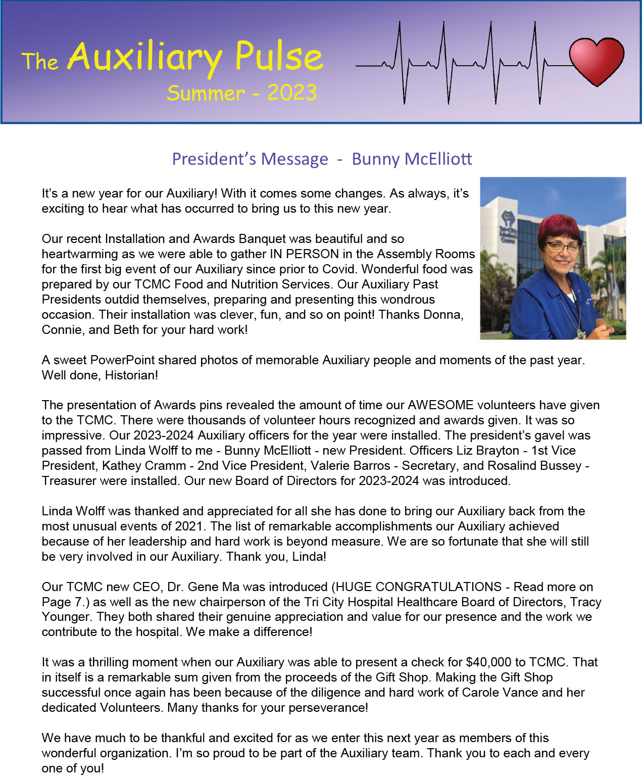 Pulse is the regular newsletter of the Tri-City Hospital Auxiliary and is a great way to keep up on what is happening in our organization. Feel free to click on a current or past edition and enjoy.