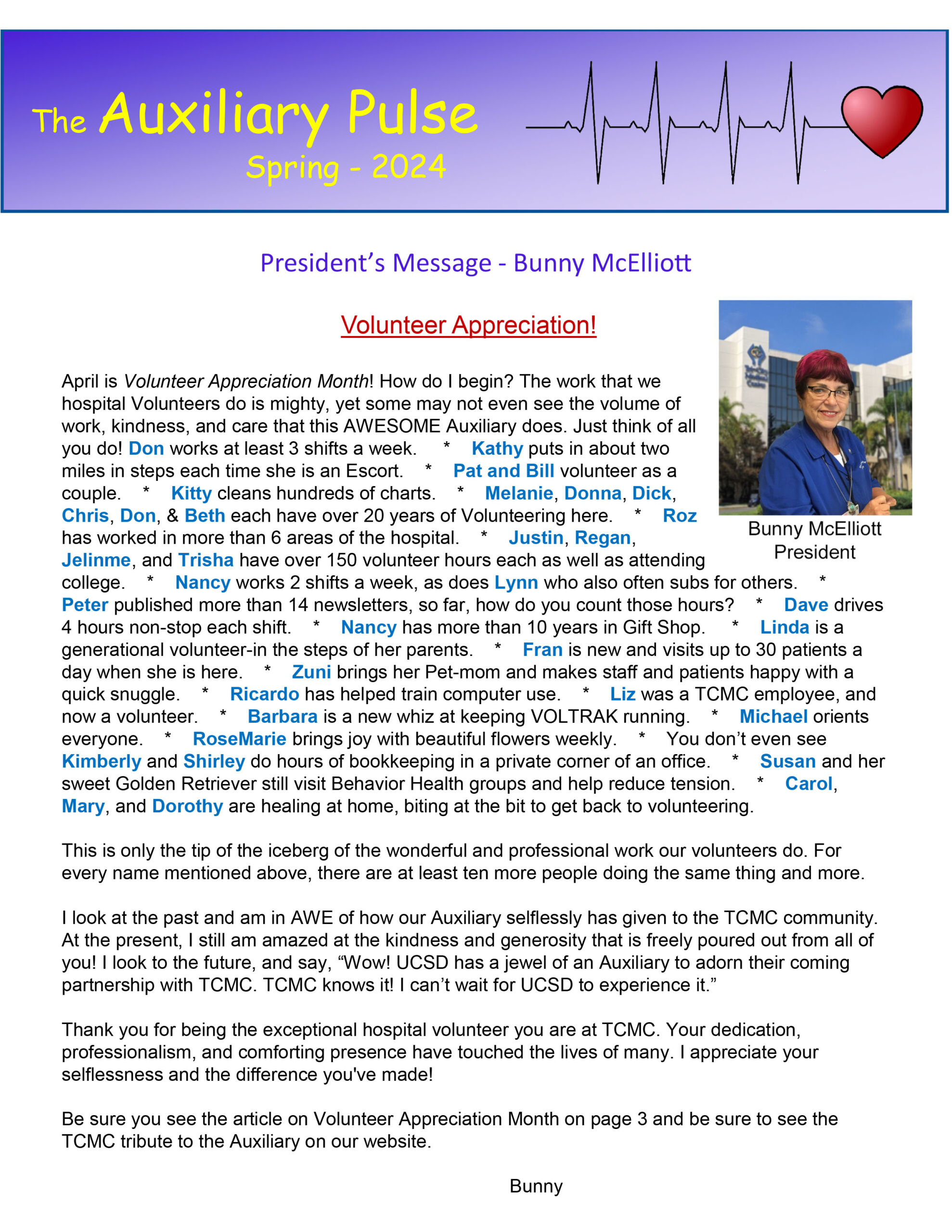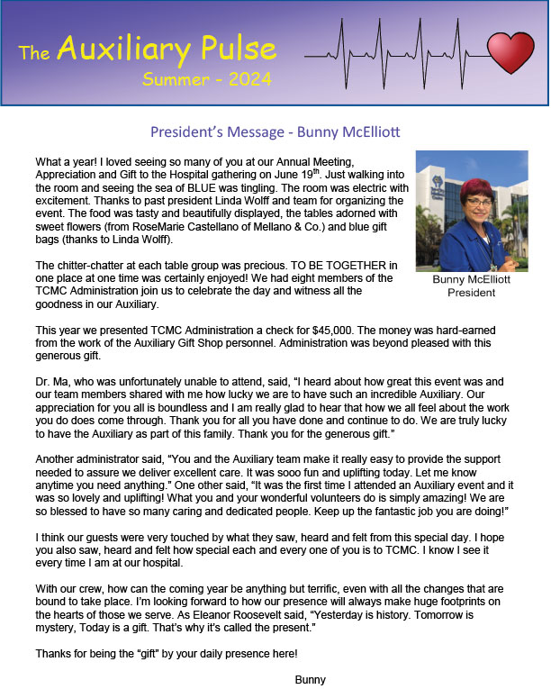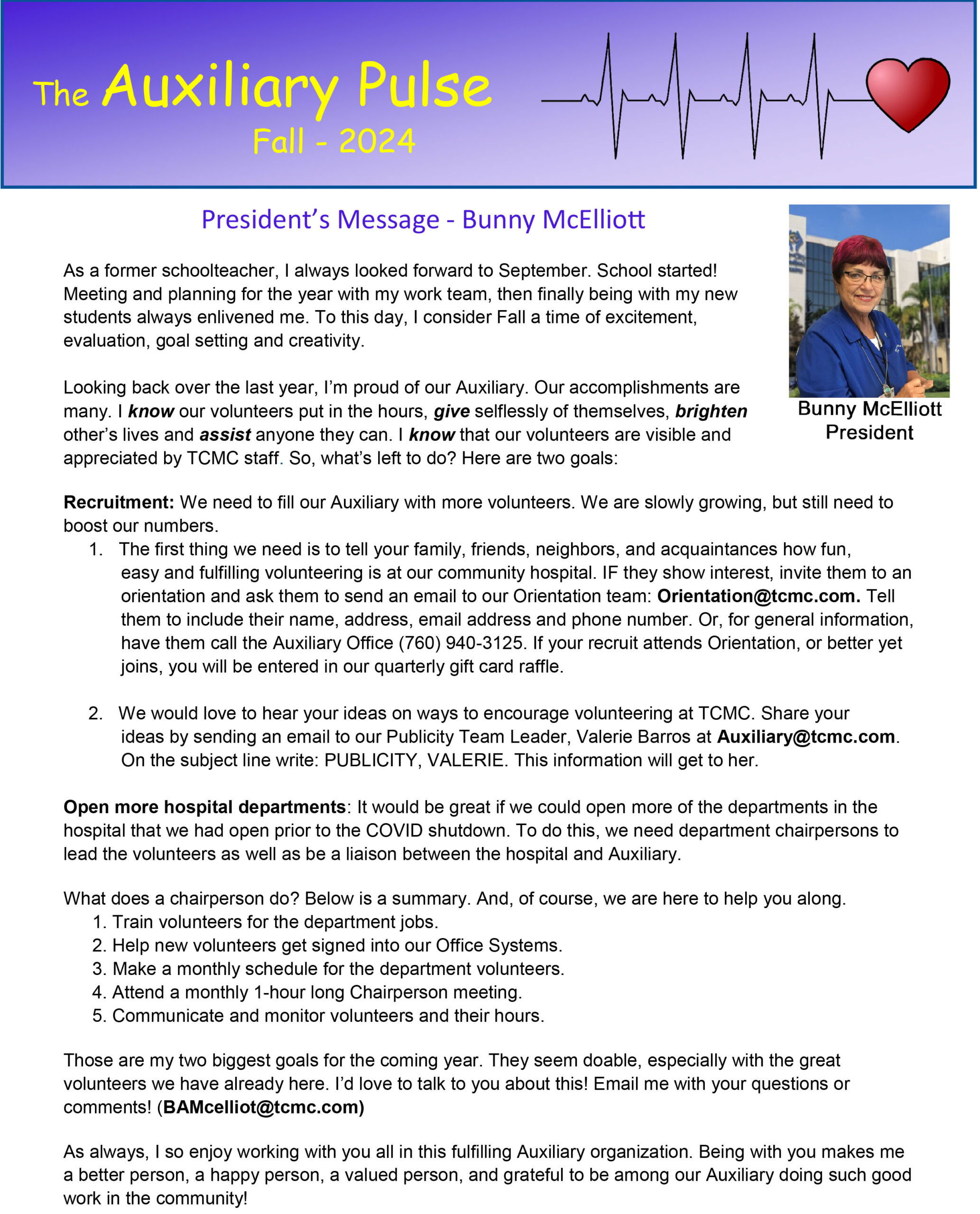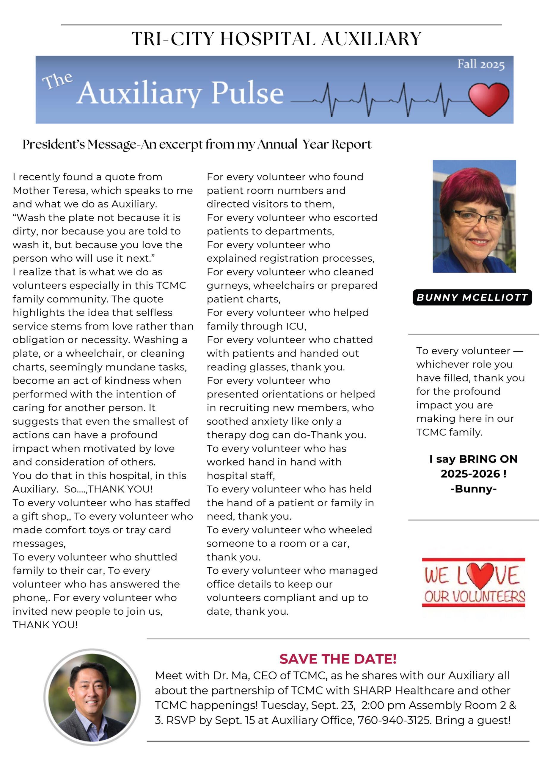 Pulse is the regular newsletter of the Tri-City Hospital Auxiliary and is a great way to keep up on what is happening in our organization. Feel free to click on a current or past edition and enjoy.
